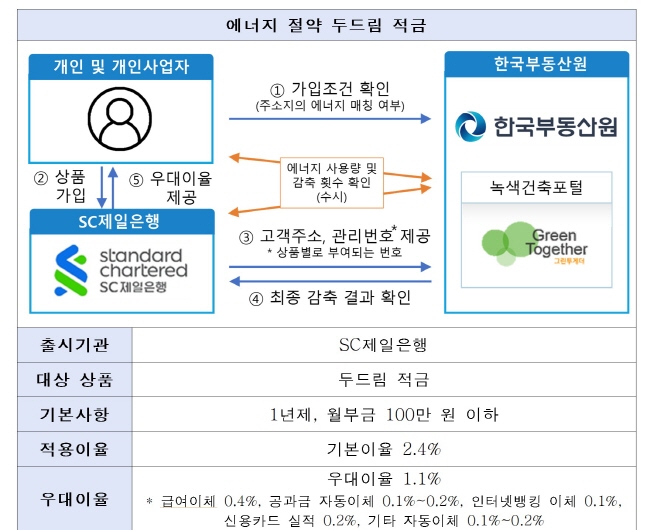 (서울=NSP통신) 강은태 기자 = 한국부동산원(원장 손태락)은 SC제일은행과 에너지 절약 실천을 금융 혜택으로 연결하는 ‘에너지 절약 두드림 적금 상품’을 출시했다.