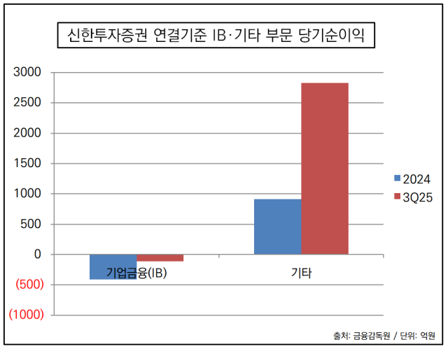 실제 신한투자증권의 IB 실적은 2024년에 이어 2025년에도 적자를 이어가고 있다. 신한투자증권은 2024년 IB부문 당기순손실 410억원을 기록했고 2025년 3분기에도 111억원 손실로 집계됐다.