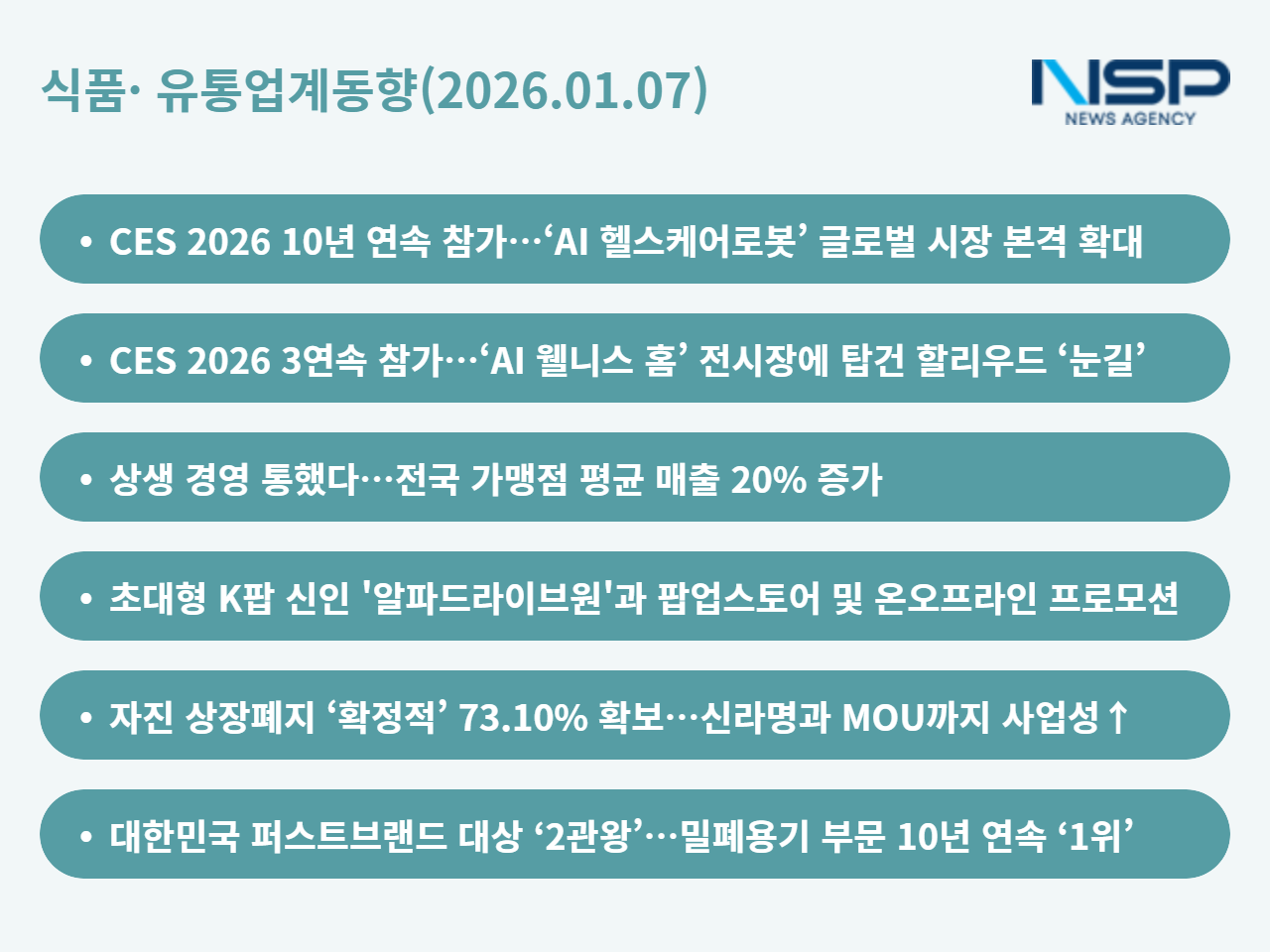 (서울=NSP통신) 옥한빈 기자 = 유통·식품업계의 새해 전략은 ‘구조를 바꾸는 실행력’으로 모아진다. 특히 이날(7일)은 기술 경쟁은 글로벌 무대에서, 사업 재편은 내부에서 동시에 진행 중이다. CES 2026 현장에서는 바디프랜드와 세라젬이 AI·로봇·주거 공간을 결합한 헬스케어 비전을 전면에 내세웠다. 바디프랜드는 10년 연속·세라젬은 3년 연속 드라이브다. 국내에서는 신세계푸드가 상장폐지 수순과 외부 MOU를 병행하며 의사결정 구조를 재정비했다. 프랜차이즈 현장에서는 bhc가 비용 부담을 본사가 떠안는 방식으로 수익 구조 개선을 이끌었다. 가맹점과의 상생을 외치며 숫자싸움을 이어나가는 모습이다. 한편 K-뷰티의 선부주자 CJ올리브영은 K-팝과 결합한 체험형 콘텐츠로 접점을 넓히고 있다. ‘알파드라이브원’과 협업하며 물 들어올 때 노가 멈추지 않는 중이다.