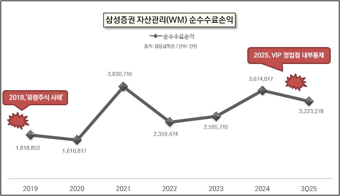 삼성증권은 2018년 유령주식 사태 이후 내부통제 전담 조직을 신설하는 등 거버넌스 체계를 정비해 왔다. 이후 WM 부문이 성장 국면에서도 비교적 큰 사고 없이 내부통제가 유지됐다는 평가를 받아왔다. 그러나 수익 규모가 본격적으로 확대된 2024~2025년 사이 VIP 영업점을 중심으로 내부통제 미흡 사례가 다시 적발되면서 기존 통제 체계가 사업 성장 속도를 따라가지 못한 것 아니냐는 시각이 제기된다.