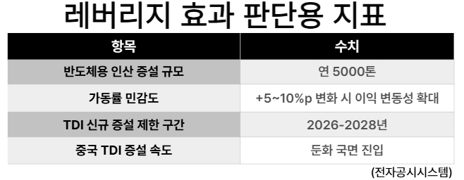 OCI는 올해 상반기 반도체용 인산 5000톤 증설을 완료하며 반도체 소재 부문 생산능력을 확대했다. 주요 고객사 증설이 본격화될 경우 추가 증설도 검토 중이다. 증설 효과가 가동률 상승으로 이어질 경우 고정비 흡수 효과에 따른 이익 레버리지 확대가 가능하다는 평가다.