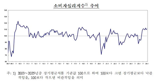 소비자심리지수는 지난해 11월 민생회복소비쿠폰의 영향으로 112.3까지 오른 뒤 12월 109.8로 2.5p 하락했다. 이후 올해 1월 110.8로 1p 올랐다.
