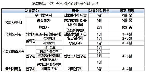 이번 공고는 국회사무처가 처음으로 주요 경력경쟁채용시험의 일정을 사전에 공개한 것으로 공고에는 채용 예정 직위로 수어통역사, 방송작가 등 신규 채용과 입법조사처 연구관, 신설 국회기록원의 기록연구사 채용 등이 포함됐다.