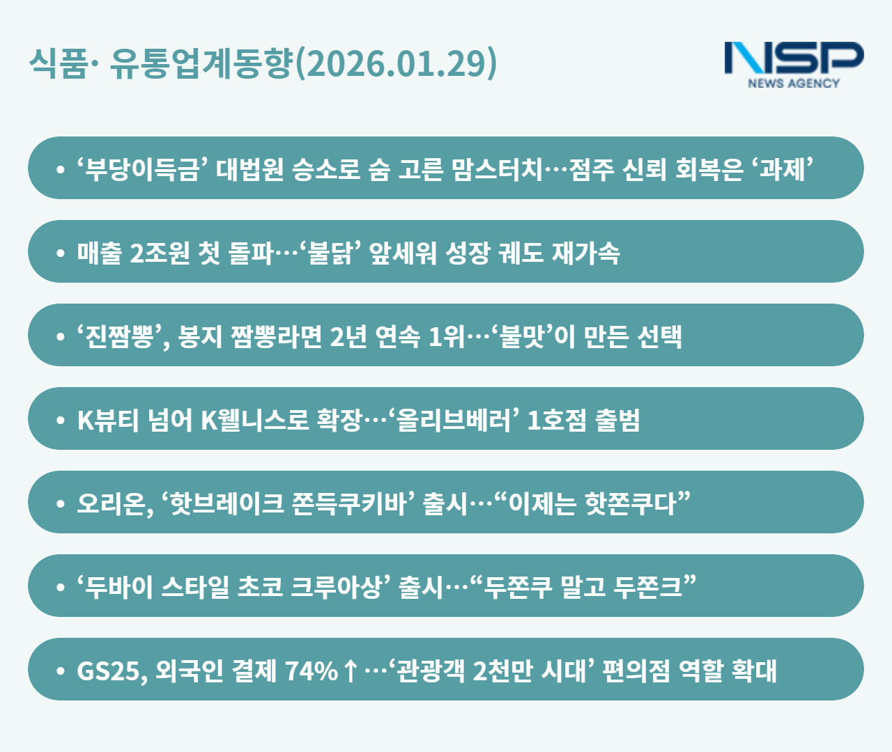 (서울=NSP통신) 옥한빈 기자 = 법원의 판단, 글로벌 히트, 그리고 트렌드 편승까지. 유통·식품업계가 분주하게 돌아갔다. 맘스터치는 대법원 승소로 법적 부담은 덜었지만, 점주 신뢰라는 구조적 과제를 다시 떠안았다. 반면 삼양식품과 오뚜기는 ‘불닭’과 ‘불맛’이라는 명확한 키워드로 글로벌·내수 시장에서 존재감을 키우며 실적과 점유율을 동시에 끌어올렸다. 소비 트렌드의 변화는 디저트 시장에서도 감지된다. 오리온과 신세계푸드는 ‘두쫀쿠’로 상징되는 쫀득한 식감 열풍을 각자의 방식으로 재해석하며 발 빠르게 숟가락을 얹었다. 여기에 CJ올리브영은 K뷰티를 넘어 K웰니스로 보폭을 넓히며 새로운 성장 실험에 나섰다. GS25는 외국인 소비 데이터를 통해 편의점이 관광 인프라로 진화하고 있음을 증명했다. 안도와 과제, 성장과 확장, 그리고 유행의 대중화까지 업계의 현재 좌표가 한 장면에 겹쳐진다.