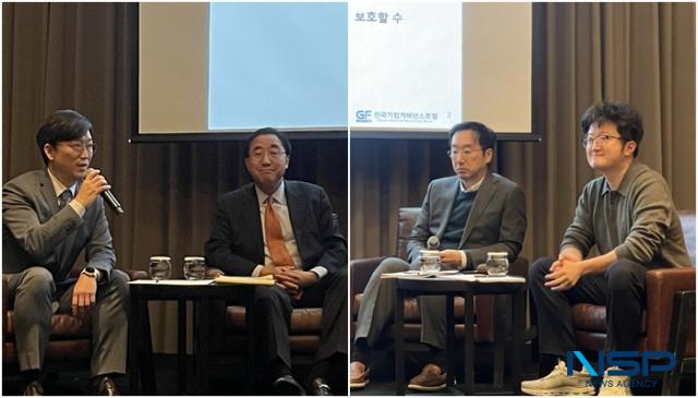 NSP통신-한국기업거버넌스포럼이 9일 개최한 개정 상법 내 경영권 방어를 주제로 한 긴급좌담회에서 (왼쪽부터)천준범 와이즈포레스트 변호사, 이남우 한국기업거버넌스포럼 회장, 김규식 비스타글로벌자산운용 변호사, 이창환 얼라인파트너스자산운용 대표가 패널 토론을 진행하고 있다. (사진 = 임성수 기자)