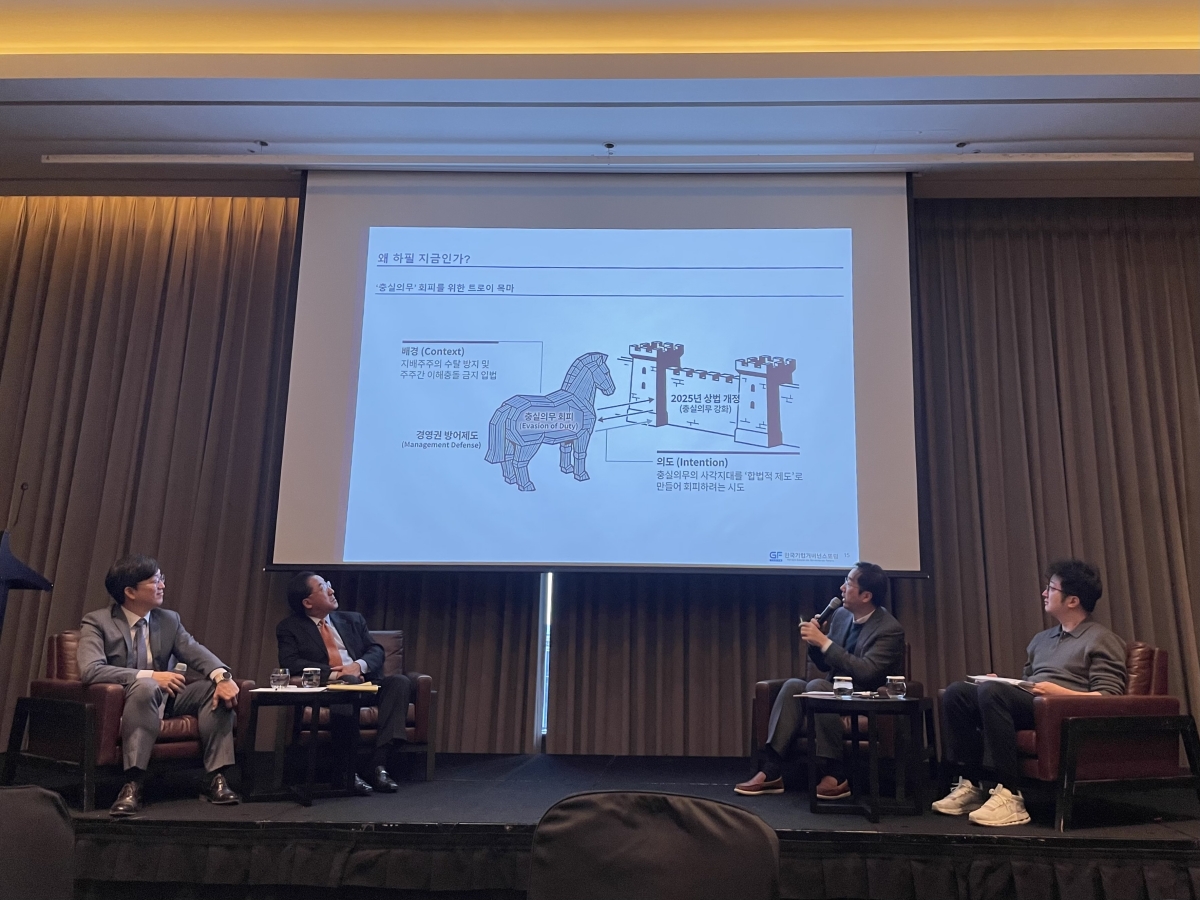 김규식 변호사는 “이사회가 전체 주주가 아닌 특정 오너를 위해 복무하며 주주에 대한 충실 의무를 이행하지 못했던 점이 코리아 디스카운트의 핵심 원인”이라며 “이로 인해 시장 전반의 밸류에이션 하락이 이어져 온 만큼 최근 재계의 경영권 방어 움직임에 대한 우려가 크다”고 말했다.