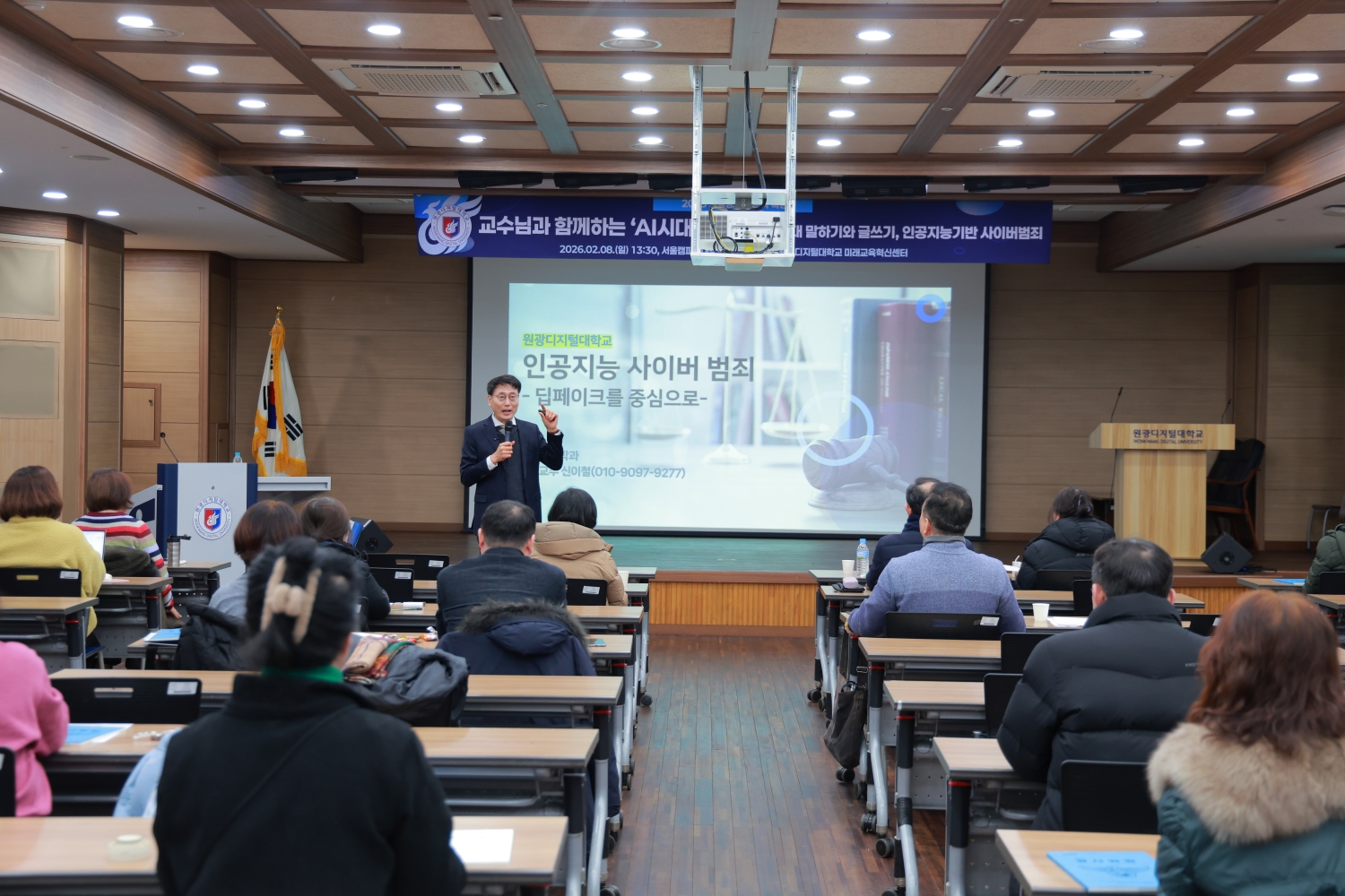 신이철 경찰학과 교수가 ‘인공지능기반 사이버범죄-딥페이크(Deepfacke)를 중심으로’ 주제로 겨울방학 인문학 강연을 하고 있다. (사진 = 원광디지털대)