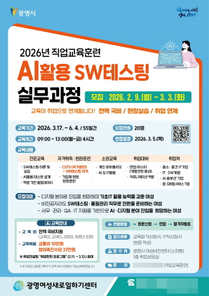 (경기=NSP통신) 김여울 기자 = 경기 광명시(시장 박승원) 광명여성새로일하기센터가 3월 3일까지 정보기술(IT) 품질관리 분야 취업을 희망하는 ‘인공지능(AI) 활용 소프트웨어(SW) 시험(테스팅) 실무과정’ 교육생을 모집한다.