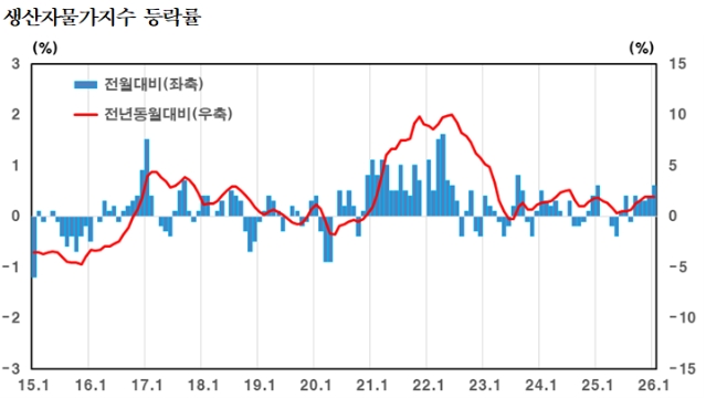 24일 한국은행이 발표한 ‘2026년 1월 생산자물가지수(잠정)’에 따르면 지난달 생산자물가지수는 전월 대비 0.6%, 전년 동월 대비 1.9% 상승했다.