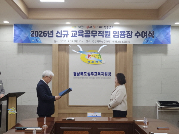 (경북=NSP통신) 김대원 기자 = 경상북도성주교육지원청(교육장 김시용)은 24일 성주교육지원청 본관 소회의실(2층)에서 3월 1일자 교육공무직원 조리원 직렬 1명에 대한 임용장 수여식을 개최했다.