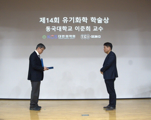(경북=NSP통신) 조인호 기자 = 동국대학교 WISE캠퍼스 바이오화학융합학부 이준희 교수가 지난 12일 한국화학연구원 대전 본원에서 열린 제45회 대한화학회 유기화학분과회 심포지엄 및 정기총회에서 제14회 ‘유기화학학술상’을 수상했다.