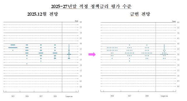 해당 지표는 금리 인하에 불리한 조합이나 점도표는 방향을 달리 했다. 정책금리는 2026년말 3.4%를 기록한 이후 2027년 이후에는 3.1% 수준이 될 것으로 예상했다.