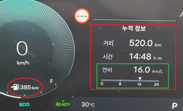 총 520km를 14시간 48분 동안 시승한 후 체크 한 현대차 산타페 1.6 하이브리드 모델의 실제 주행 연비는 16.0km/ℓ를 기록했다.