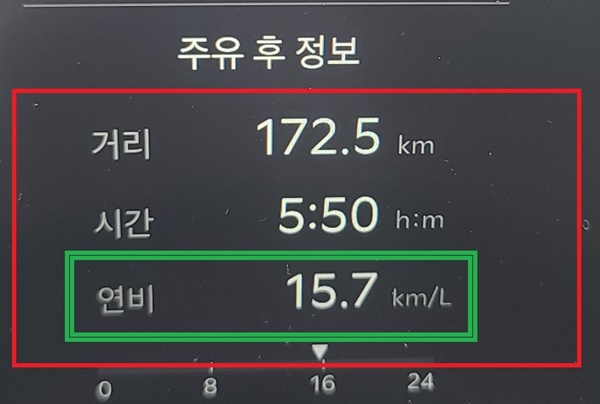 하지만 주행거리가 증가할 때마다 연비효율이 올라가는 패턴을 볼 때 200km 이상 주행 할 경우 실제 연비는 공인 복합연비 15.7km/ℓ를 초과할 것으로 느껴졌다.