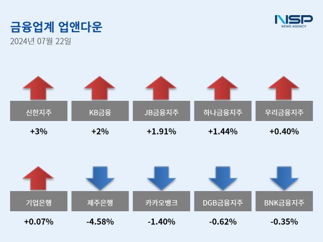 (서울=NSP통신) 강수인 기자 = 22일 코스피(-1.14%)와 코스닥(-2.26%)은 모두 하락했다. 이 가운데 은행주는 전거래일 대비 1.43% 상승했다. 은행주는 11종목 가운데 6종목이 상승, 5종목이 하락했다.