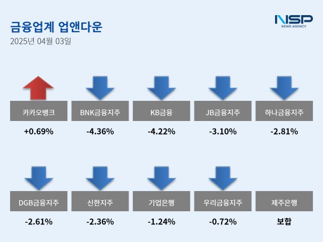 (서울=NSP통신) 강수인 기자 = 3일 미국 도널드 트럼프 대통령의 상호관세 발표로 코스피(-0.76%)와 코스닥(-0.20%)은 모두 하락했다. 이 가운데 은행주는 전거래일 대비 2.43% 하락했다. 은행주는 11종목 가운데 2종목이 상승, 8종목이 하락했다. 보합세는 1종목이다.