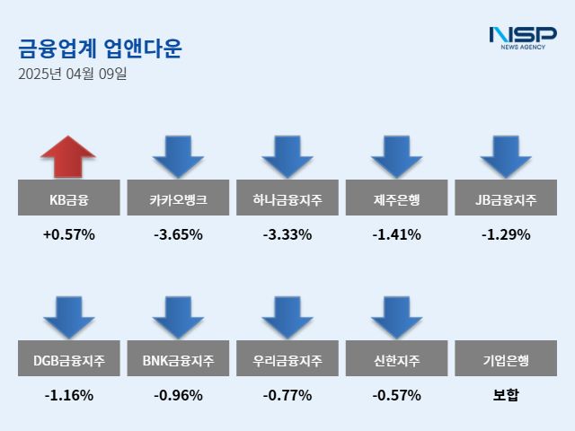 (서울=NSP통신) 강수인 기자 = 미국발 관세 발효가 본격화되자 9일 코스피(-1.74%)가 2293.70까지 내려앉았다. 코스닥(-2.29%)도 하락했다. 이 가운데 은행주는 전거래일 대비 0.94% 하락했다. 은행주는 11종목 가운데 2종목이 상승, 8종목이 하락했다. 보합세는 1종목이다.