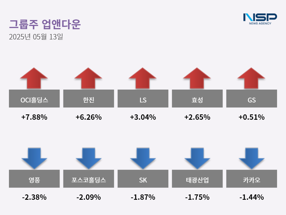 (서울=NSP통신) 최아랑 기자 = 13일 코스피(+0.04%), 코스닥(+0.89%)은 모두 상승했다. 이 가운데 10대 그룹주는 상반된 흐름을 보였다. 가장 큰 변동을 보였던 종목은 OCI홀딩스다. OCI홀딩스는 7.88%(5400원) 상승해 7만3900원으로 장을 마감했다.