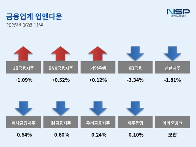 (서울=NSP통신) 강수인 기자 = 11일 코스피(+1.23%), 코스닥(+1.96%)은 모두 상승했다. 이 가운데 은행주는 전거래일 대비 1.39% 하락했다. 은행주는 11종목 가운데 3종목이 상승, 7종목이 하락했다. 보합세는 1종목이다.