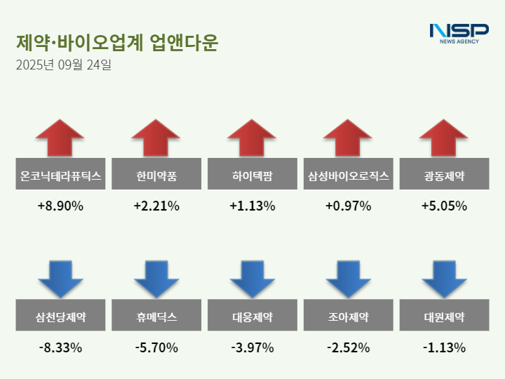 온코닉테라퓨틱스는 전거래일 대비 8.90%(4300원) 올라 5만2600원으로 장을 마감했고 한미약품은 전거래일 대비 2.21%(8500원) 올라 39만3000원으로 장을 마쳤다.