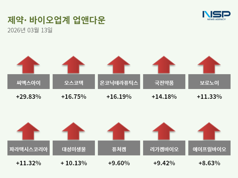 온코닉테라퓨틱스와 국전약품은 각각 16.19%(3650원)와 14.18%(600원) 상승해 2만6200원과 4830원에 거래를 마감했다.