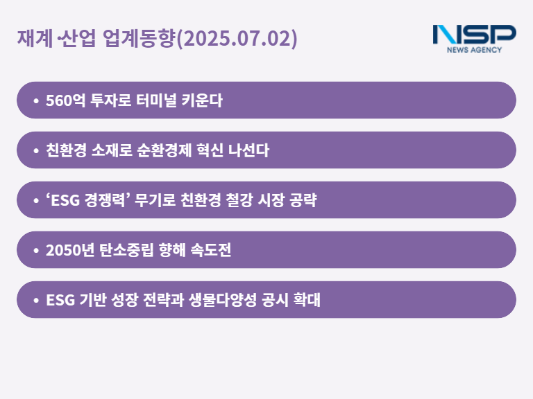 (서울=NSP통신) 최아랑 기자 = 주요 기업들이 환경과 성장 전략을 동시에 잡기 위한 ESG 성과를 연이어 공개하고 있다. 탄소중립을 향한 중장기 감축 계획부터 친환경 소재 기술, 해외 물류기지 확장 등 각사의 전략은 다르지만 목표는 지속가능한 경쟁력 확보 하나다.