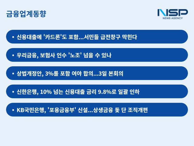(서울=NSP통신) 강수인 기자 = 역대급 부동산 규제에 카드론도 포함되면서 이에 따른 부작용에 대한 우려가 나온다. 서민들과 소상공인의 급전 창구 기능이 주를 이룬 카드론이 막히면 제도권 밖으로 밀려날 수 있다는 것이다. 한편 동양생명·ABL생명 자회사 편입에 성공한 우리금융지주는 ‘노조’라는 암초에 부딪혔다.