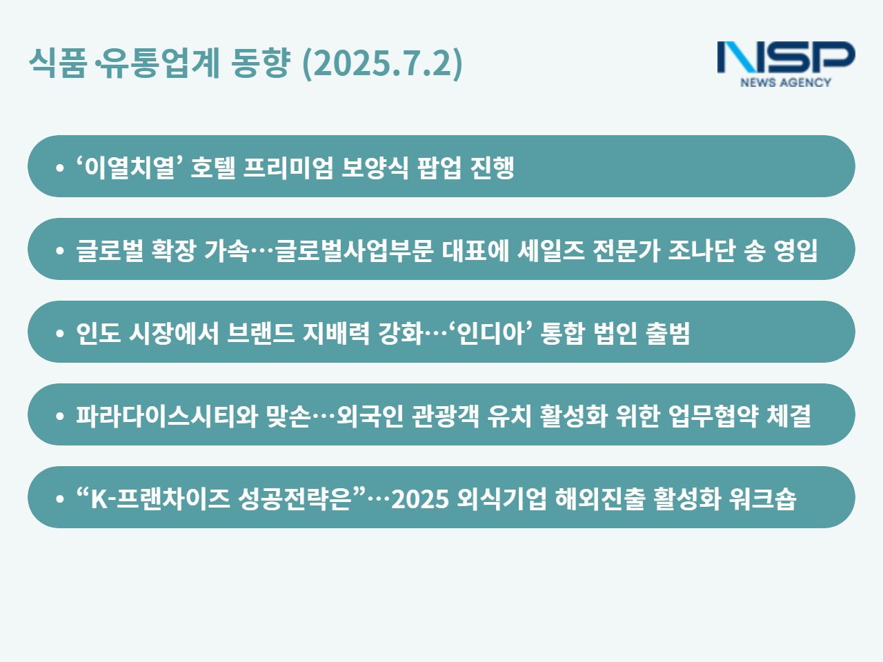 (서울=NSP통신) 옥한빈 기자 = 무더위와 장마가 기승을 부리는 요즘 식품·유통 업계는 또 새로운 것들을 준비하느라 바쁘다. 시시각각 때때로 변화하는 고객들의 니즈 속, 이날은 롯데백화점의 여름대비가 눈에 띈다. 뜨거운 여름을 이열치열로 잡는 프리미엄 보양식 팝업이 그 주인공. 한편 CJ대한통운·롯데웰푸드·신라면세점은 각기 다른 글로벌 공략법을 선보인다. 어떤 곳은 현지 전문가의 임원 선임, 어떤 곳은 현지 법인 통합 및 확대 등 올해 승자는 누가 될것인지 지켜봐야 하는 상황이다.