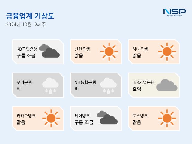 (서울=NSP통신) 강수인 기자 = 2024년 10월 2주차 금융업계기상도는 신한은행·하나은행·카카오뱅크·토스뱅크의 ‘맑음’, 케이뱅크·KB국민은행의 ‘구름조금’, IBK기업은행의 ‘흐림’, 우리은행·NH농협은행의 ‘비’로 기록됐다.