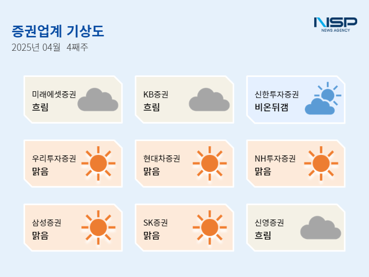 (서울=NSP통신) 설희 기자 = 2025년 4월 4주차 증권업계기상도는 우리투자증권·현대차증권·NH투자증권·삼성증권·SK증권의 ‘맑음’, 미래에셋증권·KB증권·신영증권의 ‘흐림’, 신한투자증권의 ‘비온뒤갬’으로 기록됐다.