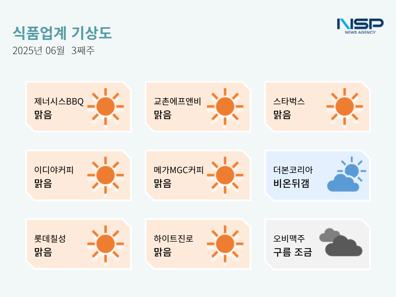 (서울=NSP통신) 옥한빈 기자 = 6월 2주차 업계 날씨를 살펴보면 대체로 맑다. 굵직한 이슈로는 제너시스BBQ와 더본코리아, 오비맥주가 눈에 띈다. 한편 새로운 정권이 들어선 후 민생 경제를 외치며 다각도로 정책 수정이 이뤄지고 있어 식품계도 긴장을 늦출 수 없는 상황. 이럴 때는 확실한 카드가 아니라면 가만히 있는 게 상책일 수 있다. 오비맥주는 하필 이럴 때 ‘탈세 의혹’이라는 위험한 이슈에 휘말렸다.