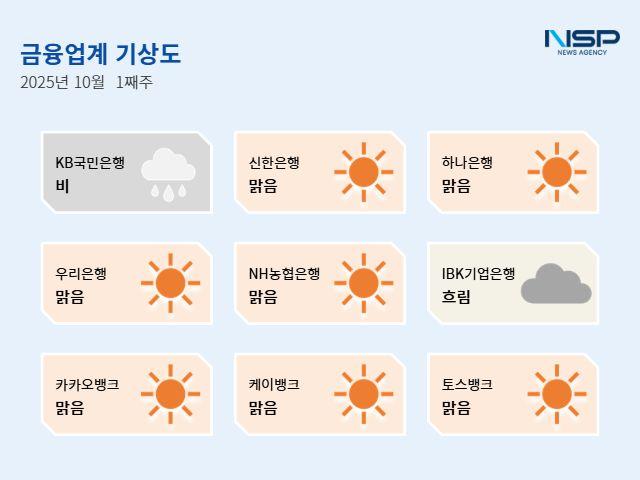 (서울=NSP통신) 강수인 기자 = 10월 1주차 금융업계기상도는 KB국민은행의 ‘비’, IBK기업은행의 ‘흐림’, 신한은행·하나은행·우리은행·NH농협은행·카카오뱅크·케이뱅크·토스뱅크의 ‘맑음’으로 기록됐다.
