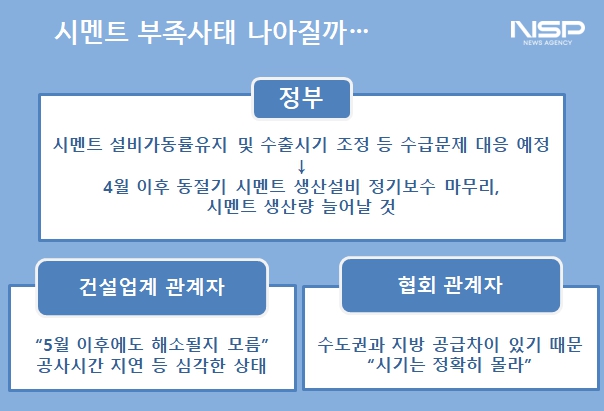 (서울=NSP통신) 정의윤 기자 = 최근 시멘트 공급 부족사태로 인해 전국 곳곳의 건설현장이 중단되거나 지연되는 상황이 발생하고 있다. 이에 정부는 수출시기 조정으로 물량을 확보하는 등 내수물량 확보에 나선 가운데 이 사태의 해소 시점을 오는 5월로 전망하고 있지만 협회와 건설업계 실무자들은 “예측하기 어렵다”는 반응이다.