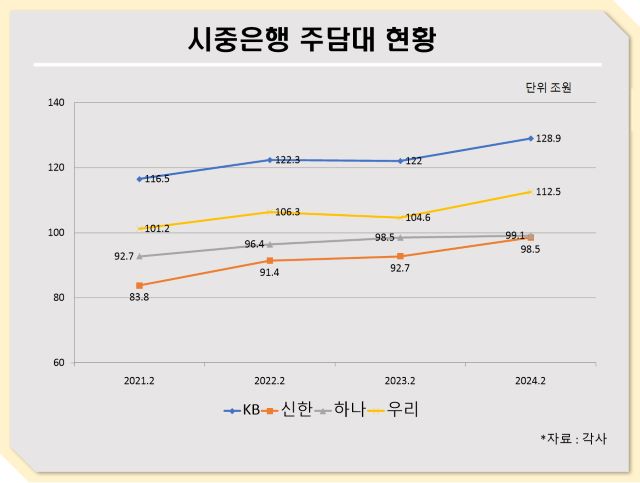 5일 은행권에 따르면 지난 2월말 기준 KB국민은행, 신한은행, 하나은행, 우리은행의 주택담보대출 잔액은 총 439조 1989억원으로 집계됐다. 2023년 2월말(416조 296억원) 대비 23조 1693억원 증가한 수준이다.