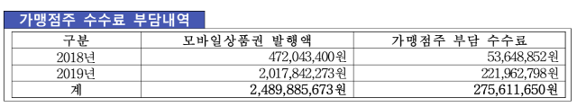 2018~2019년 메가커피 가맹점주 수수료 부담내역. 2016~2017년은 앤하우스의 관련 자료 폐기·미보관으로 수수료 부담 내역 파악 불가했다. (표 = 공정위 제공)