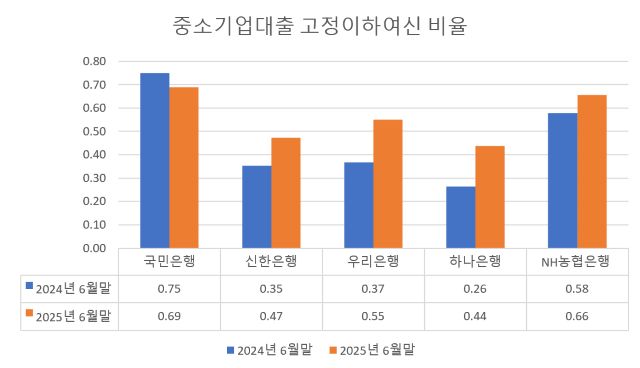 은행별로 살펴보면 KB국민은행의 중소기업대출 부실대출 비율은 지난해 6월말 0.75%에서 올해 6월말 0.69%로 0.06%p 낮아졌다. 반면 같은 기간 우리은행은 0.37%에서 0.55%로 상승폭이(0.18%p)로 가장 컸다. 하나은행은 0.26%에서 0.44%로 0.17%p 상승했고 신한은행은 0.35%에서 0.47%로 0.12%p 높아졌다. NH농협은행은 0.58%에서 0.66%로 0.08%p 상승했다.