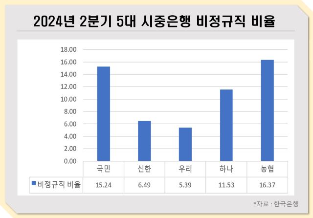 은행별로 살펴보면 직원수 대비 비정규직원 비율이 가장 높은 곳은 NH농협은행(16.37%)이다. 이후 ▲KB국민은행 15.24% ▲하나은행 11.53% ▲신한은행 6.49% ▲우리은행 5.39% 순으로 나타났다.