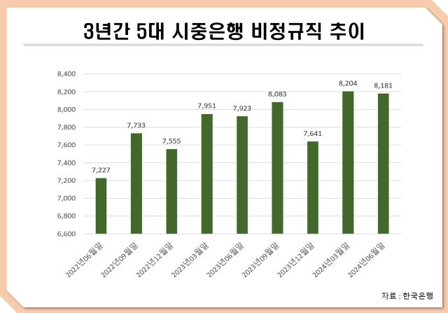 12일 한국은행에 따르면 5대 시중은행의 올 2분기 비정규직 비율은 11.2%로 나타났다. 지난 2022년 6월말 기준 9.8%를 기록한 이후 2023년 6월말 10.9%, 2024년 6월말 11.2%로 꾸준히 증가했다.