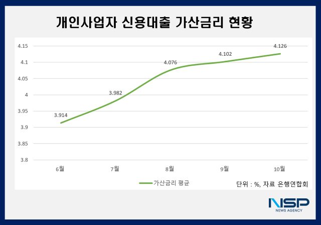 15일 은행연합회 공시에서 5대 시중은행(KB국민은행·신한은행·하나은행·우리은행·NH농협은행)의 개인사업자 신용대출 평균 가산금리(신규취급액 기준)를 그래프로 나타내보니 지난 6월말부터 10월말까지 상승곡선을 그렸다.