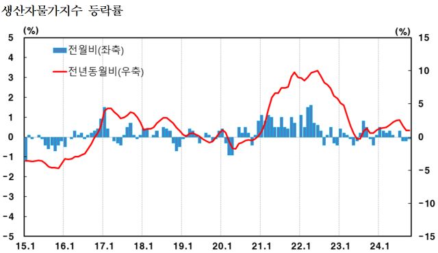 20일 한국은행이 발표한 ‘2024년 10월 생산자물가지수(잠정)’에 따르면 지난달 생산자물가지수는 공산품 등이 올랐으나 농림수산품 등은 내려 전월 대비 0.1% 하락했다.