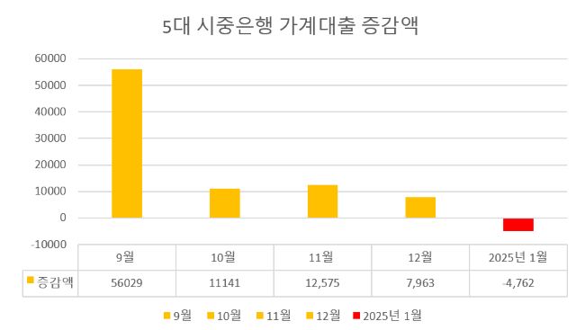 3일 5대 시중은행(KB국민·신한·하나·우리·NH농협)의 지난해 12월말 대출잔액을 살펴보면 가계대출 잔액은 총 733조 6589억원으로 전월 대비 4762억원 감소했다. 이는 지난해 3월 이후 열달 만에 보인 감소세다.