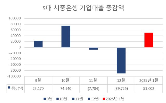 5대 시중은행의 기업대출 잔액은 지난달 825조 7228억원으로 전월 대비 5조 1002억원 증가했다. 지난해 11월 7704억원 감소한 뒤 12월 8조 9725억원 큰 폭 줄어든 이후 다시 증가한 것이다. 이는 연초 기업들이 유동성을 확보하는 등 계절적 요인이 반영됐다.