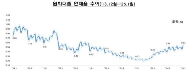 28일 금융감독원이 발표한 ‘2025년 1월말 국내은행의 원화대출 연체율 현황(잠정)’에 따르면 지난 1월 말 원화대출 연체율은 0.53%로 집계됐다. 이는 지난해 12월 말(0.44%) 대비 0.09%p, 지난해 1월말(0.45%) 대비 0.08%p 상승한 수치다.