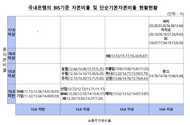 지난해 말 20개 국내은행의 CET1 비율은 14.01%로 전분기말 대비 0.52%p 하락했다. 8개 은행지주는 12.87%로 전분기말 대비 0.15%p 하락했다. 은행권의 규제비율은 기본자본비율 9.5%, 총자본비율은 11.5% 이상이다.