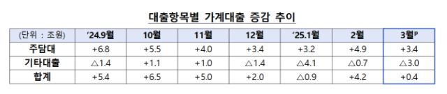 9일 금융위원회가 발표한 ‘2025년 3월중 가계대출 동향(잠정)’에 따르면 지난달 전금융권 가계대출은 총 4000억원 증가해 전월(4조 2000억원) 대비 증가폭이 축소됐다. 주택담보대출 잔액이 증가한 만큼 기타대출이 줄어든 영향이다.