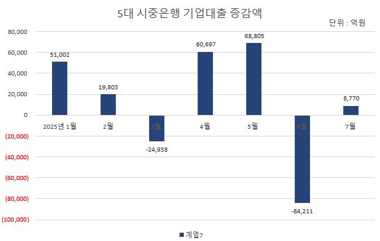 기업대출은 증가 전환했다. 지난달 말 기준 기업대출 잔액은 830조 6154억원으로 전월 대비 8770억원 늘었다. 기업대출 기업대출 잔액은 지난 1월 5조 1002억원 증가에서 2조 1조 9803억원 증가로 증가폭이 대폭 줄어든 후 3월 2조 4938억원 감소로 전환했다. 이후 4월과 5월 6조원대 증가세를 유지하다 6월 8조 4211억원 대폭 감소했다.