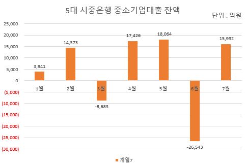 기업대출 증가세를 이끈 것은 중소기업대출이다. 중소기업대출 잔액은 665조 6860억원으로 전월 대비 1조 5992억원 증가했다. 지난 6월 2조 6543억원 감소한 이후 한 달 새 증가 전환했다.