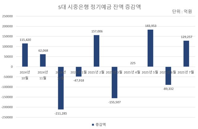 정기예금 잔액은 금리 인하 기조에 막차 수요가 몰리면서 지난 5월 전월 대비 18조 3953억원 증가한 이후 6월 8조 9332억원 감소했다가 증가 전환했다.