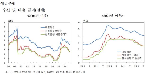 30일 한국은행이 발표한 ‘2025년 8월 금융기관 가중평균금리’에 따르면 지난 8월중 신규취급액 기준 저축성수신금리는 연 2.49%로 전월 대비 0.02%p 하락했다. 지난해 10월 3.37%를 기록한 이후 11개월연속 하락이다.