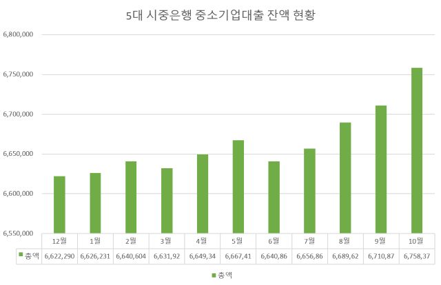6일 KB국민은행·신한은행·하나은행·우리은행·NH농협은행에 따르면 지난달 이들 은행의 중소기업대출 잔액은 675조 8371억원으로 전월 대비 4조 7494억원 증가했다.